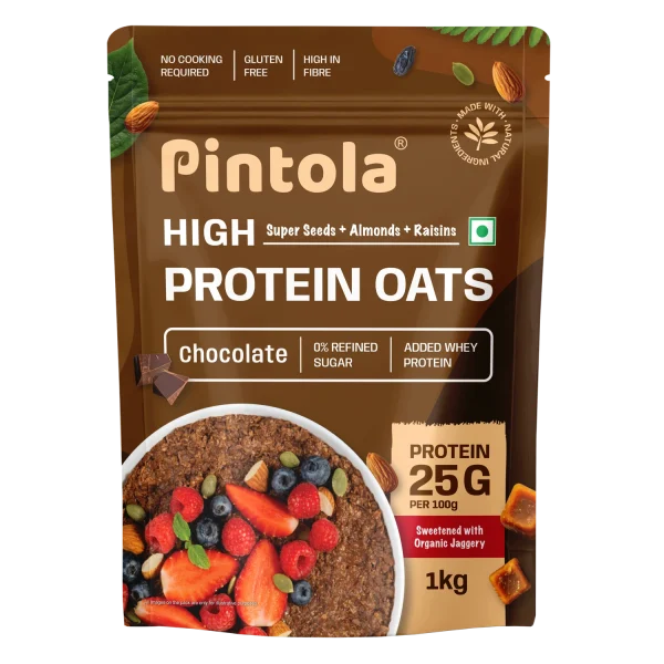 Enhance your daily nutrition with Pintola High Protein Oats Dark Chocolate With Almonds, Raisin, Pumpkin & Chia Seeds – 1 Kg, available on jantasupplements.com. This nutrient-rich oats blend delivers protein, fiber, and wholesome ingredients to power your mornings, fuel your workouts, or support balanced eating.