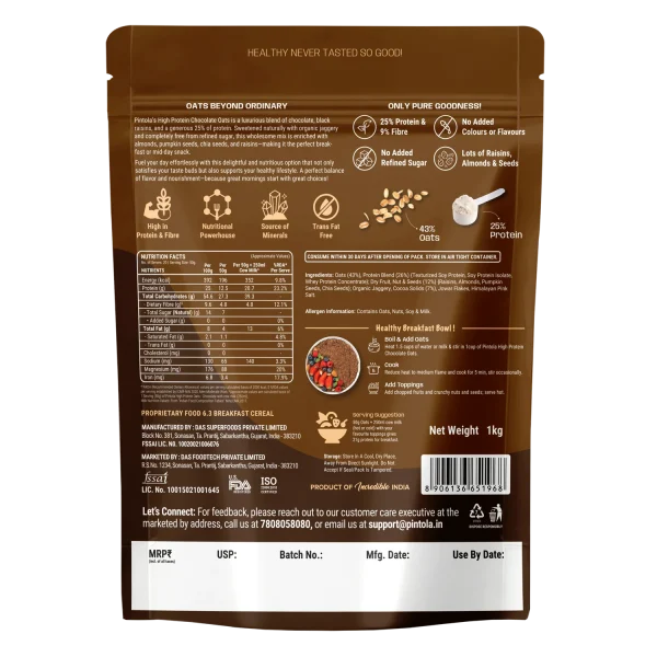 Each serving of this high-protein oats provides approximately 22–25 g of protein, helping support muscle repair, energy maintenance, and satiety throughout the day — making it a smart choice for anyone focused on fitness, active lifestyles, or better nutritional habits. The oats are fortified with chia seeds and pumpkin seeds, offering essential fatty acids, antioxidants, and additional nutrients that support heart health and metabolic function.